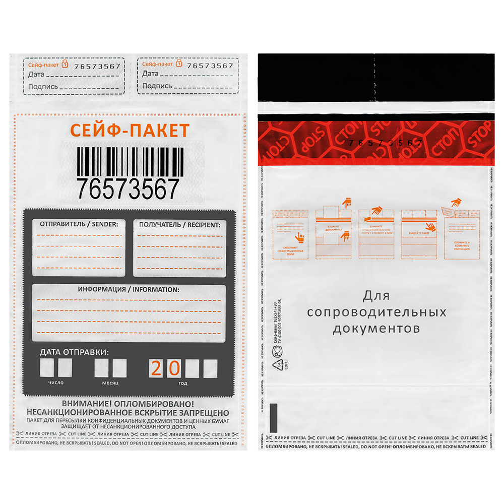 Курьерский пакет изготовлен из непрозрачного влагонепроницаемого трехслойного полиэтилена высокого давления, что обеспечивает дополнительную сохранность посылки. Внешний белый и внутренний черный слои пакета позволяют надежно скрыть его содержимое.