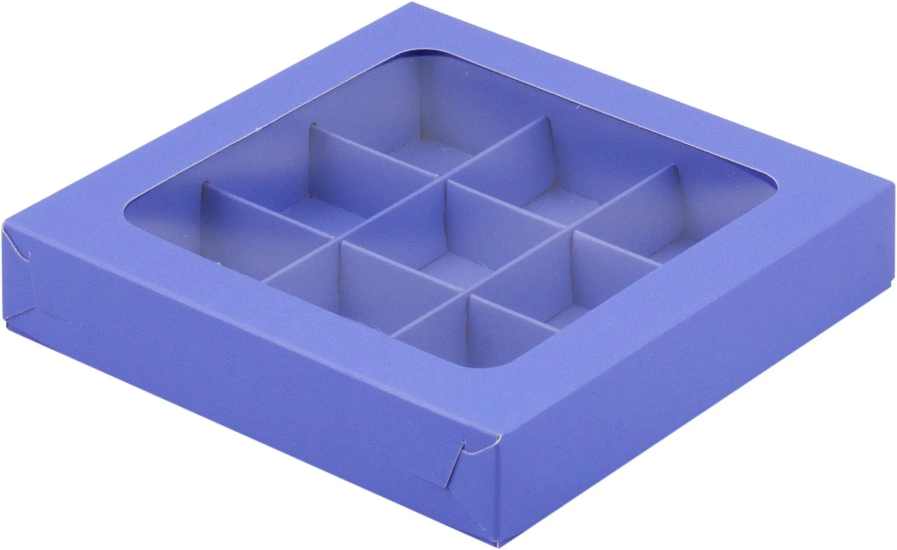 коробка бум. 155х155х30 для 9 конфет лавандовая с окном