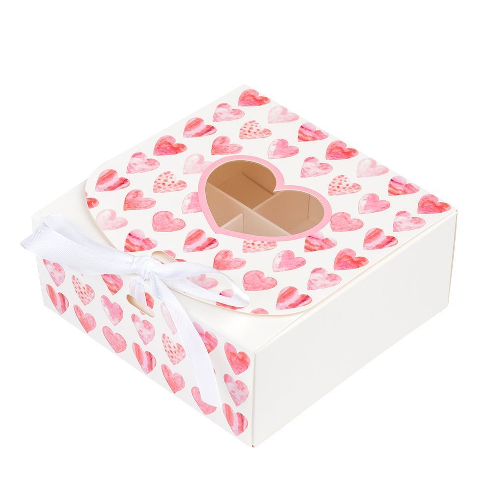 Коробка бумажная для конфет Сердца красные с окном и лентой. Используют для упаковки и транспортировки конфет при доставке.