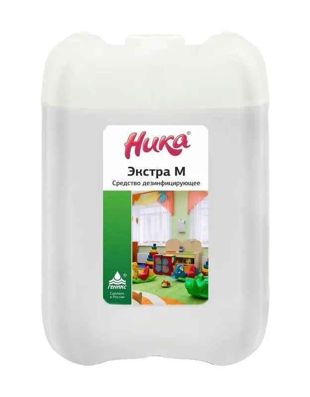 Дезинфицирующее средство «Ника‑Экстра М» 5 кг — концентрированное безхлорное дезинфицирующее и моющее средство на основе ЧАС для мойки и дезинфекции поверхностей, посуды, белья, санитарно‑технического оборудования и предметов ухода за больными.