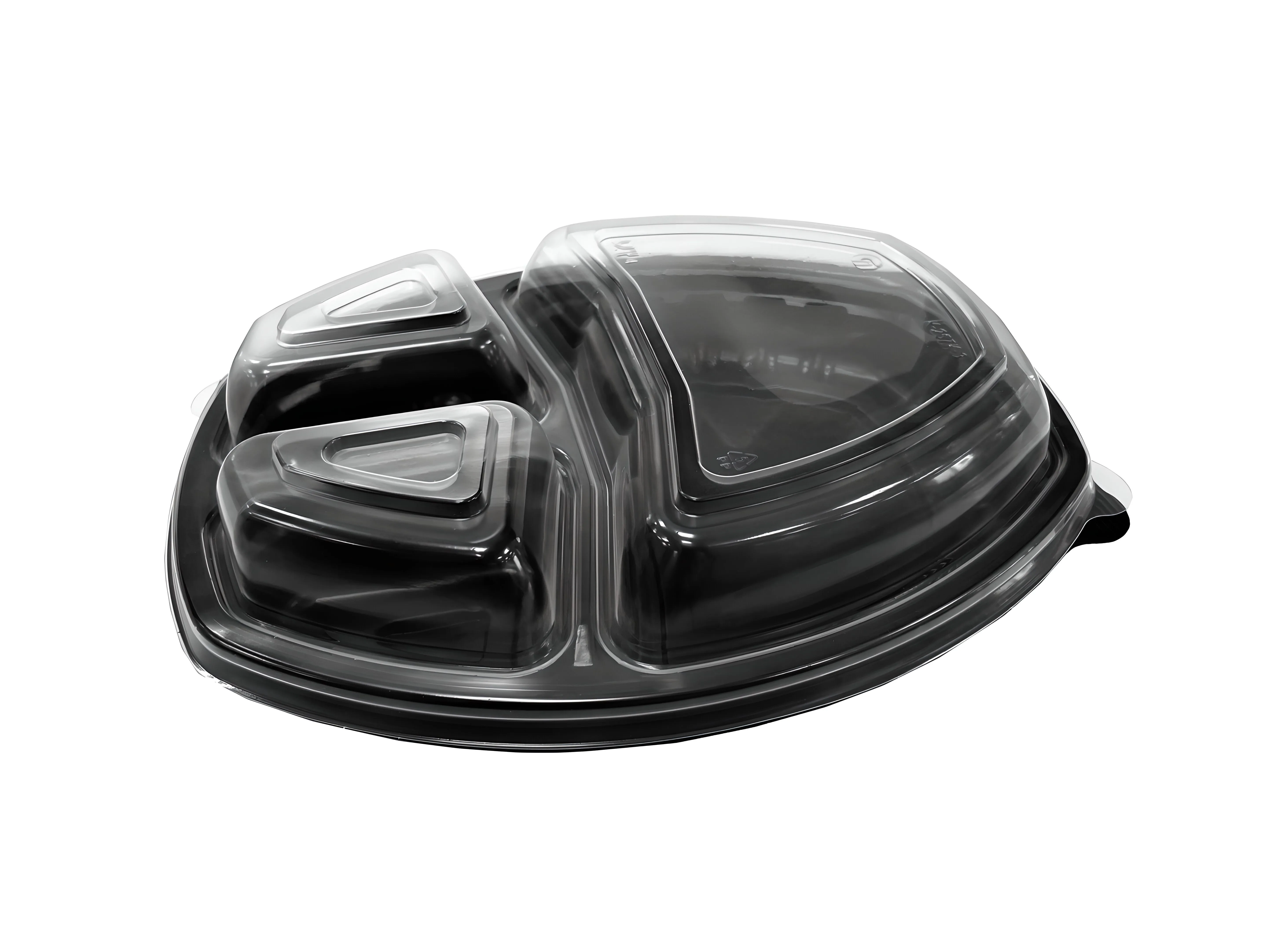 Одноразовый овальный 3-х секционный пластиковый контейнер ланч-бокс для горячего. Прекрасно выдерживает температуру горячих блюд, а также можно разогревать в микроволновой печи (СВЧ).