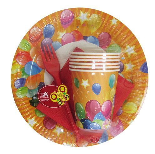 В набор входят: тарелки бумажные 6шт, стаканы бумажные 0,2 л 6шт, вилки пластиковые красные 6 шт, салфетки красные