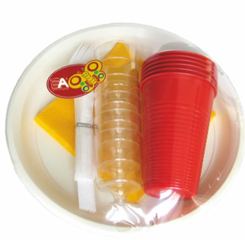 В наборе: тарелка 205 мм — 6шт, рюмка 0,05 л — 6шт, стакан 0,2 л — 6шт, вилки — 6шт, зубочистки в индивидуальной упаковке — 6шт, салфетки