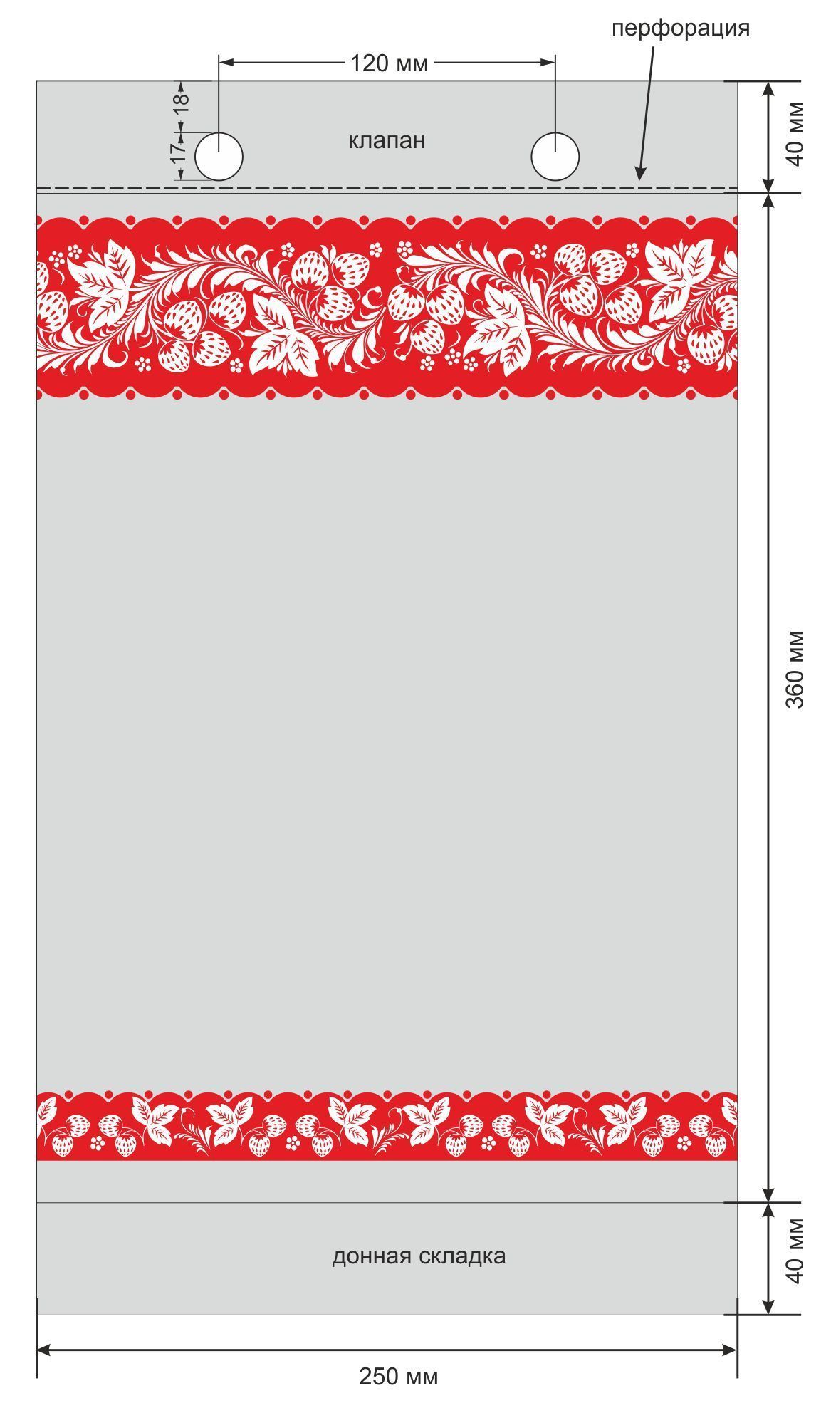 Размер пакета: 250х360+40 мм (ширина х длина + донная складка).